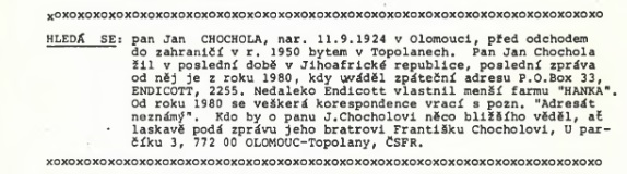 Poslední pokus učinil jeho bratr František (můj děda) hned po Revoluci. Napsal inzerát do krajanského časopisu Našinec. I ten zůstal ale bez odpovědi. Dnes už víme, že tou dobou byl Jan Chochola osm let mrtvý.